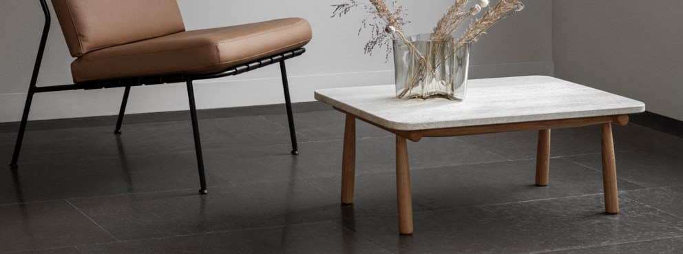 The Domus table has a limestone table top and a frame made of solid oak treated with wax oil. The table was designed in 2020 by Norm Architects to extend the DUX collection. The Domus collection also includes the revitalised Domus chair wood with matching stool and Domus chair steel.