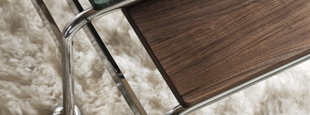 Based on Bruno Mathsson’s original table, designed to accompany his classic chair, this option provides the largest amount of surface space, but with the same elegant aesthetics of the Karin collection. The chrome-plated frame is topped in exclusive marble, limestone or walnut.