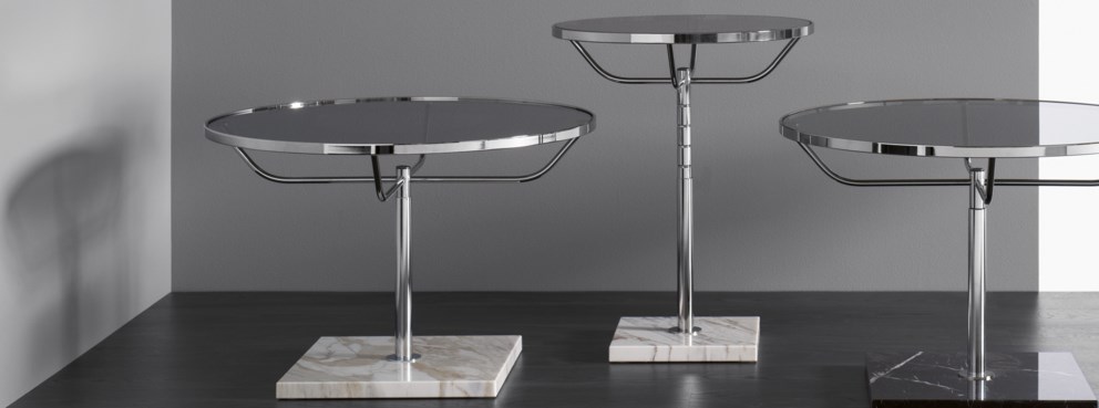 Ett klassiskt runt bord med kromat stativ, manuell höjdjustering och marmorfot.