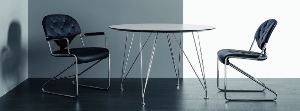 Ett klassiskt bord med kvadratisk form i kromat eller svart utförande samt en bas- och bordsskiva av glas.