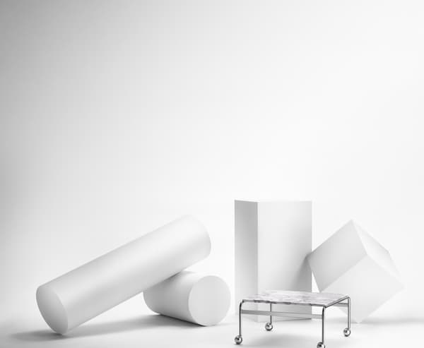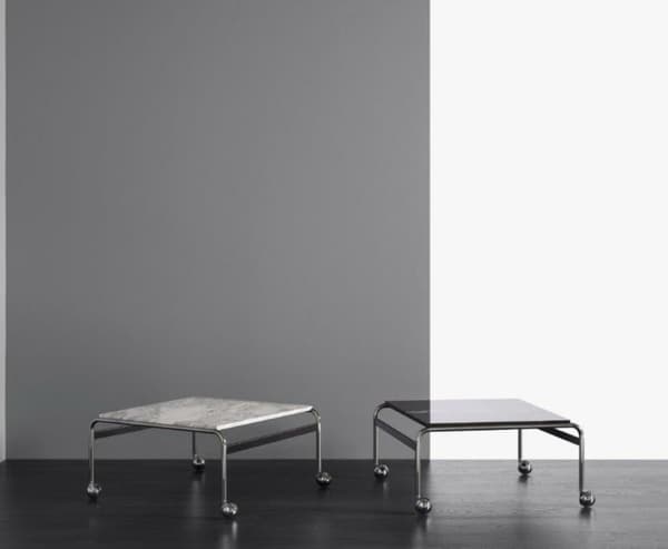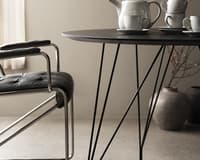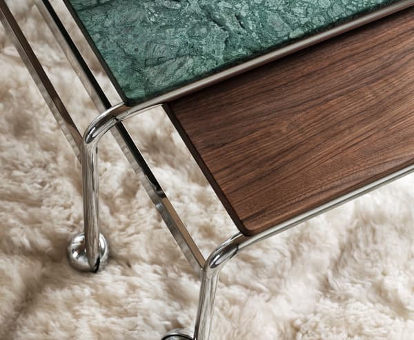 Bruno Mathsson designade bordet som ett komplement till sin klassiska fåtöljserie Karin. Den eleganta estetiken hos Karin-kollektionen syns tydligt i det kromade underredet med bordsskiva i exklusiv marmor eller valnöt.