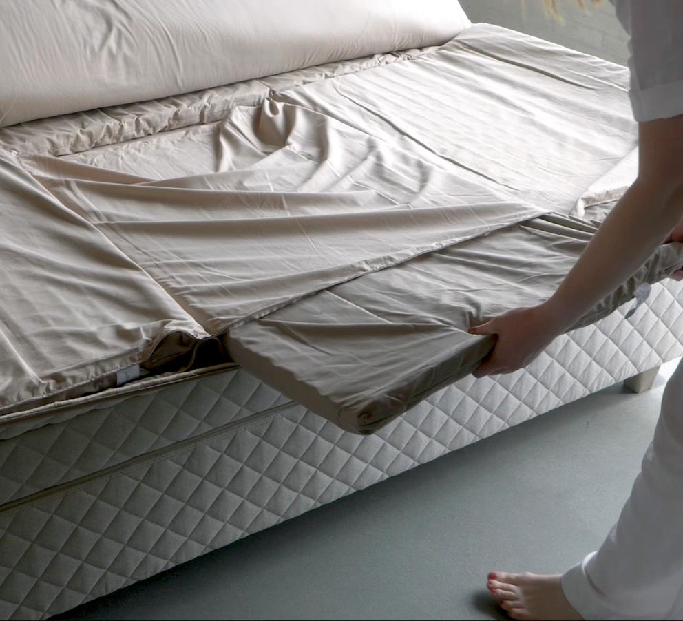 DUX 60 bygger på vårt Pascal-system med utbytbara fjäderkassetter med ett extra lager spiraler i form av en tvådelad madrass och underrede.
