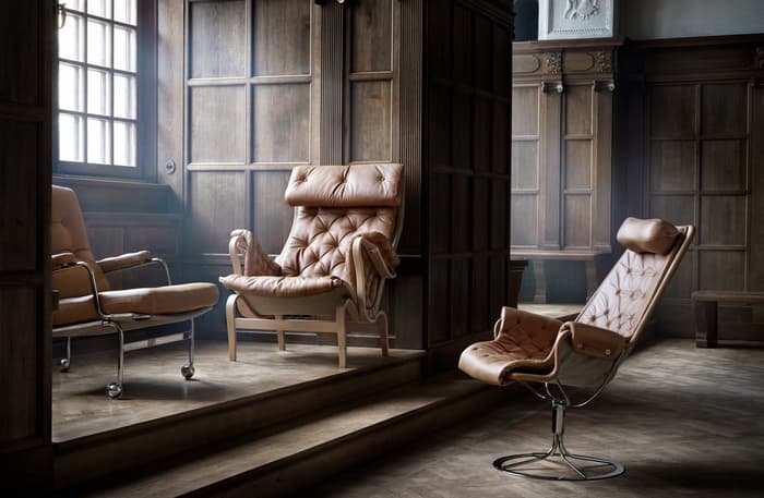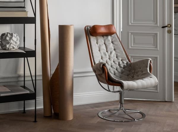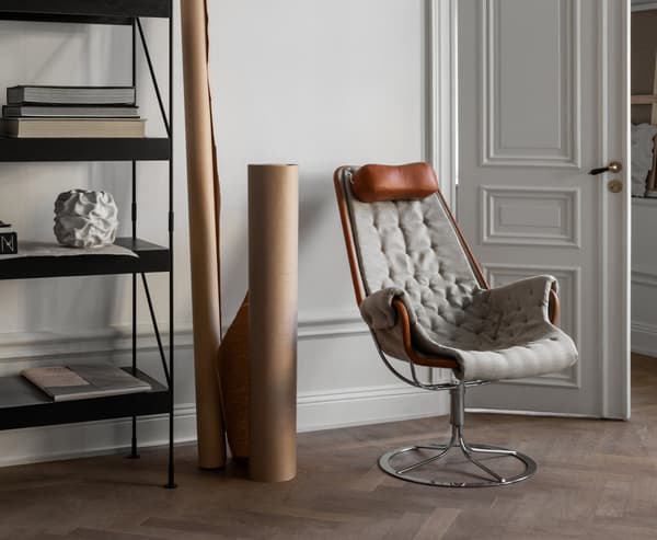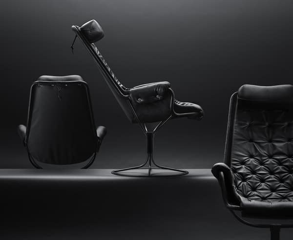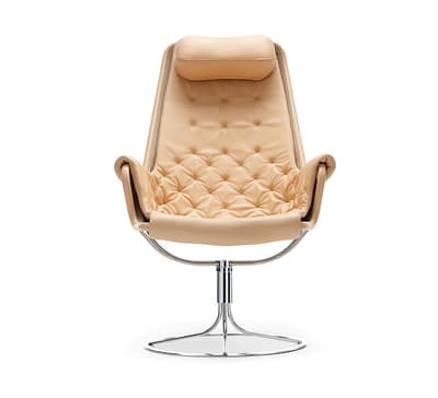 Bruno Mathsson 设计的标志型休闲椅。Jetson 椅子完美体现了他对舒适和经典的瑞典现代设计风格的痴迷。它采用碗形座椅,符合人体工程学设计的高背,带头枕。镀铬旋转底座配有独特的自返回机构。