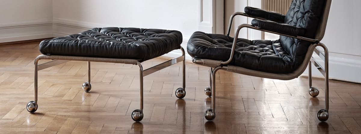 Karin 73 以其面世年份命名,是 Bruno Mathsson 设计的 Karin 扶手椅的第一款升级产品。这款优雅脚凳是该系列的必备之选,配有衬垫,以及带有支撑网的镀铬框架,提供超级舒适感。