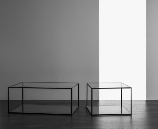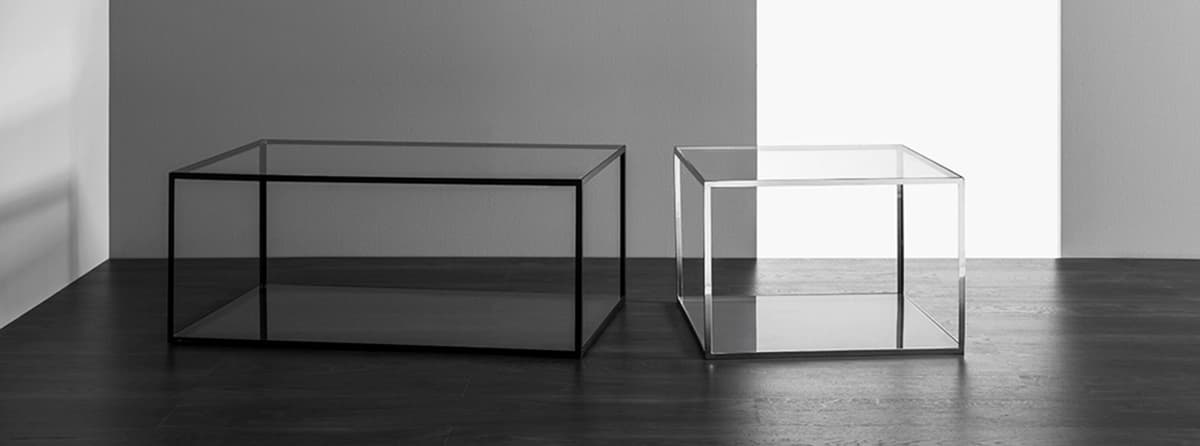 一款采用铬合金或黑色金属制成的经典方形桌子,配有玻璃桌面和底部。